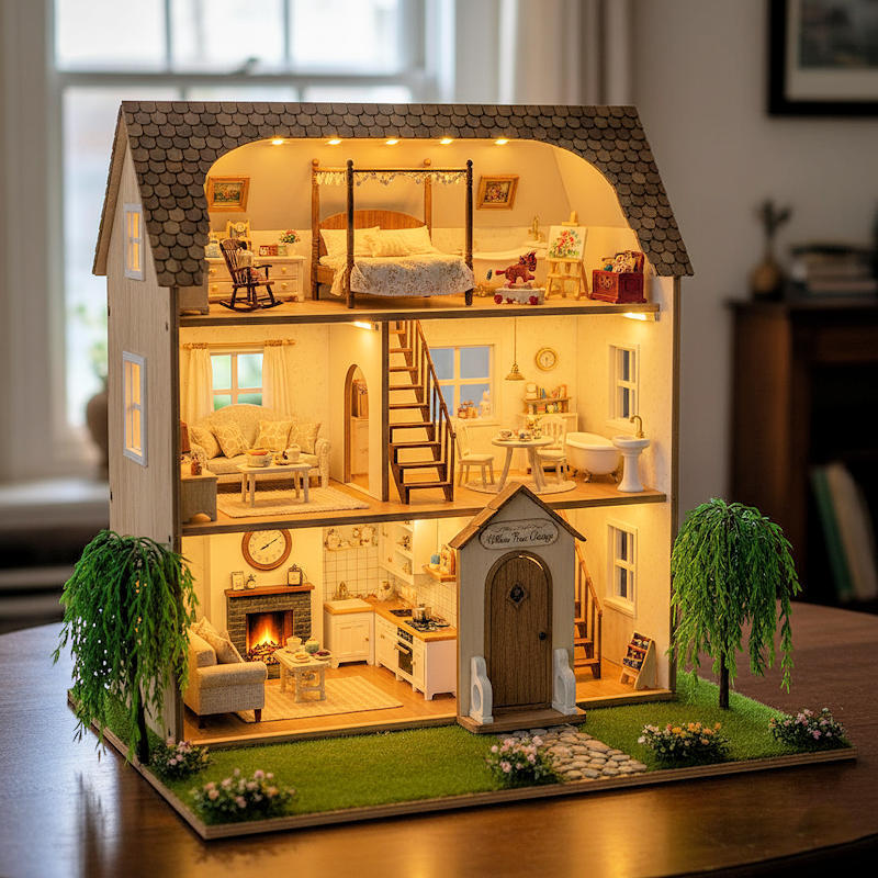 Once assembled, the Willow Tree Cottage is beautifully detailed and realistic. LED lighting adds a cozy atmosphere, making the finished dollhouse both decorative and playable. A truly rewarding project for craft enthusiasts.